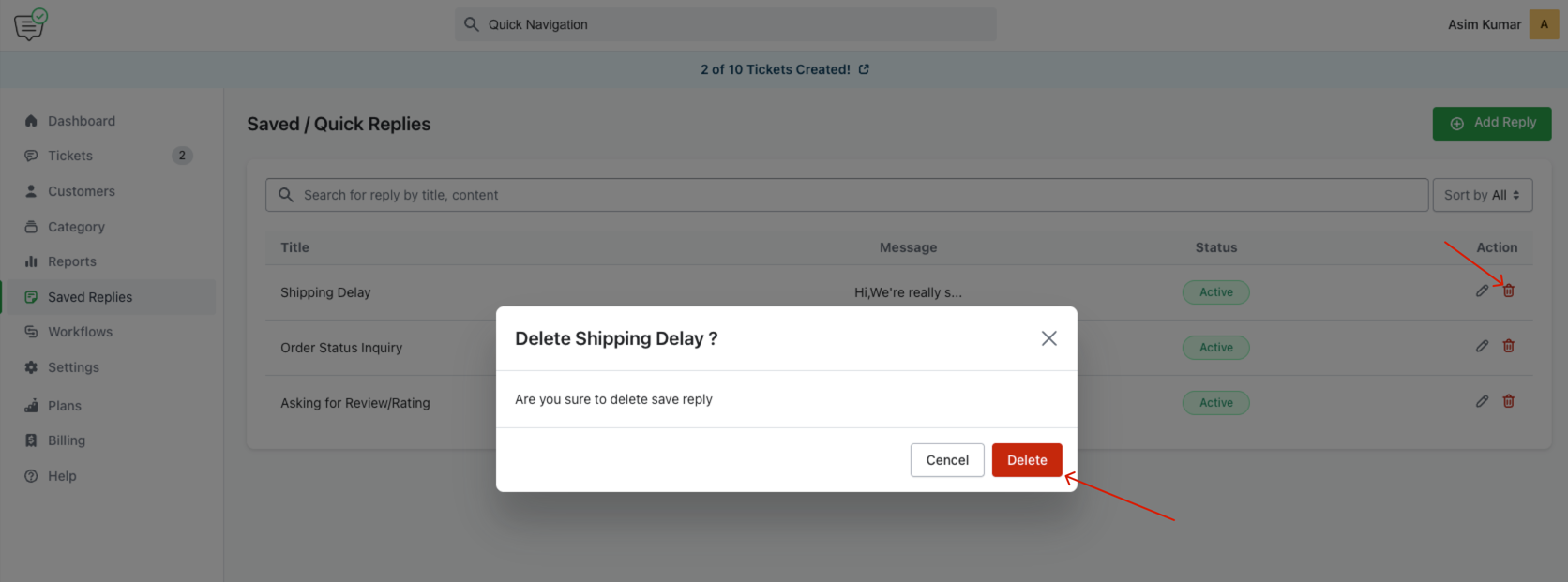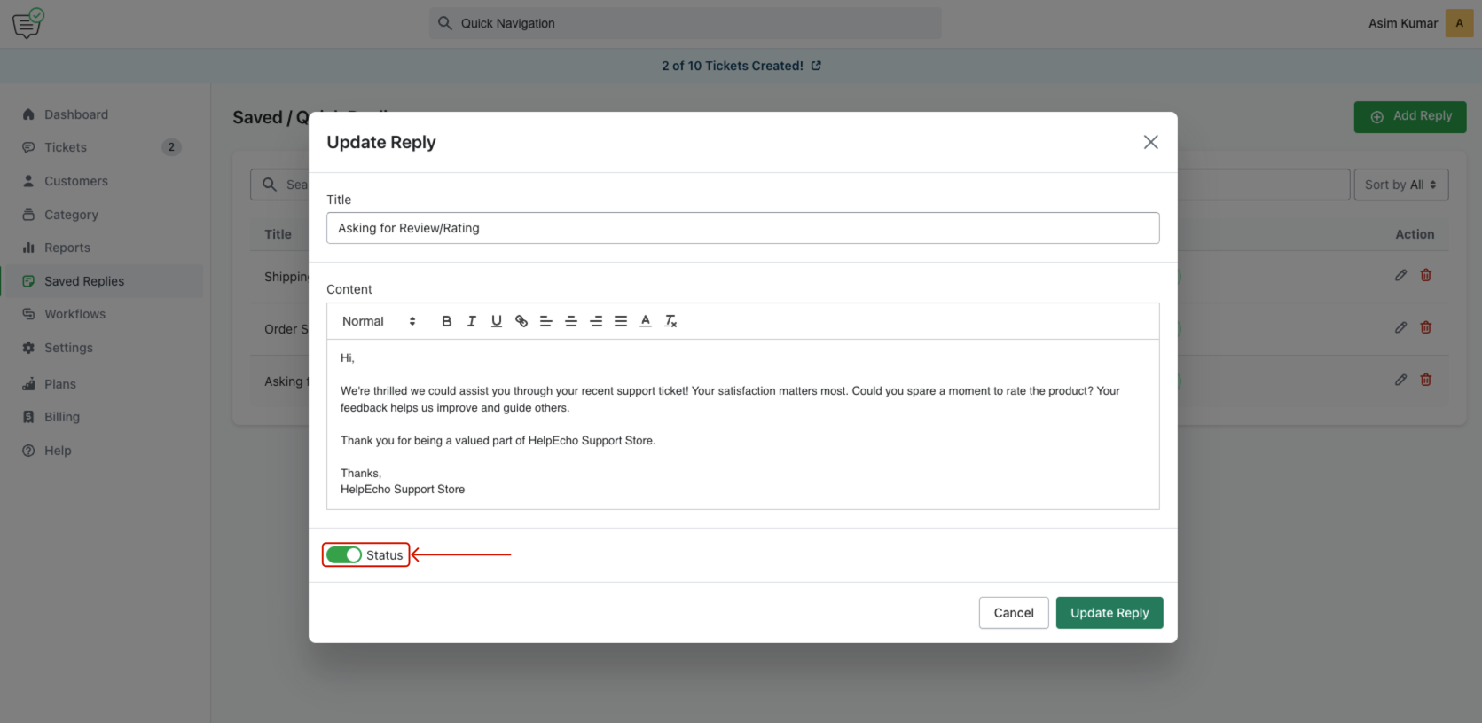 Saved Replies (also known as Quick Replies) help support agents respond to common customer queries faster. HelpEcho allows you to manage your saved replies directly from the Saved Replies menu in your dashboard.